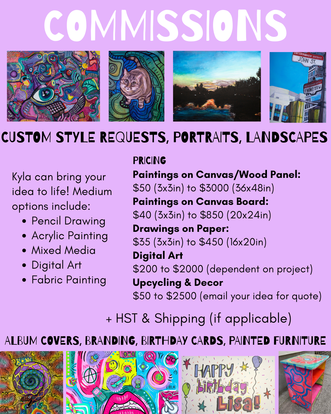 Custom Style Requests, Portraits, Landscapes, Album Covers, Branding, Birthday Cards, or Painted Furniture.
